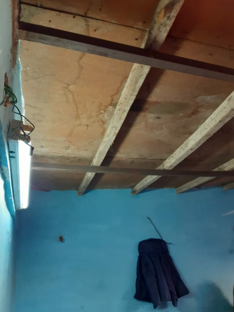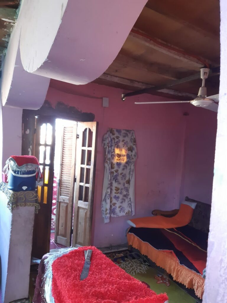 بتاخد معاش ٣٢٣ جنيه وعايشة مع ابنتها المطلقة، والشقة حالتها سيئة جدا فوق السطوح، والسقف من الخشب والمطر بينزل على العفش